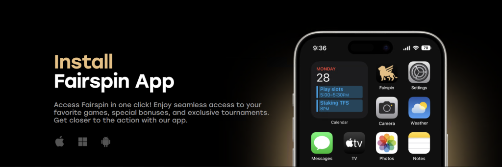 Fairspin ne zahtijeva zasebno preuzimanje iz trgovine aplikacija. Naš Fairspin app temelji se na PWA tehnologiji. Jednostavno otvorite našu web stranicu u pregledniku svog telefona (Safari ili Chrome), otvorite izbornik preglednika i odaberite “Add to Home Screen” (Dodaj na početni zaslon). To će stvoriti ikonu na vašem telefonu koja otvara kasino preko cijelog zaslona i nudi brzinu i funkcionalnost sličnu aplikaciji bez opterećivanja memorije telefona.