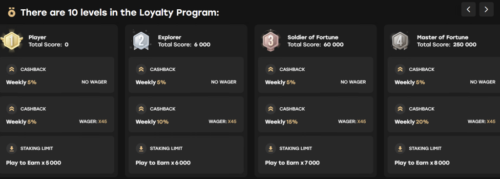 - Razina 1 (Player): Ovo je vaša početna točka. Već ovdje sudjelujete u sustavu od 5% tjednog cashbacka koji nema nikakve zahtjeve za ulaganje. To znači da dio gubitaka dobivate natrag kao čisti novac.